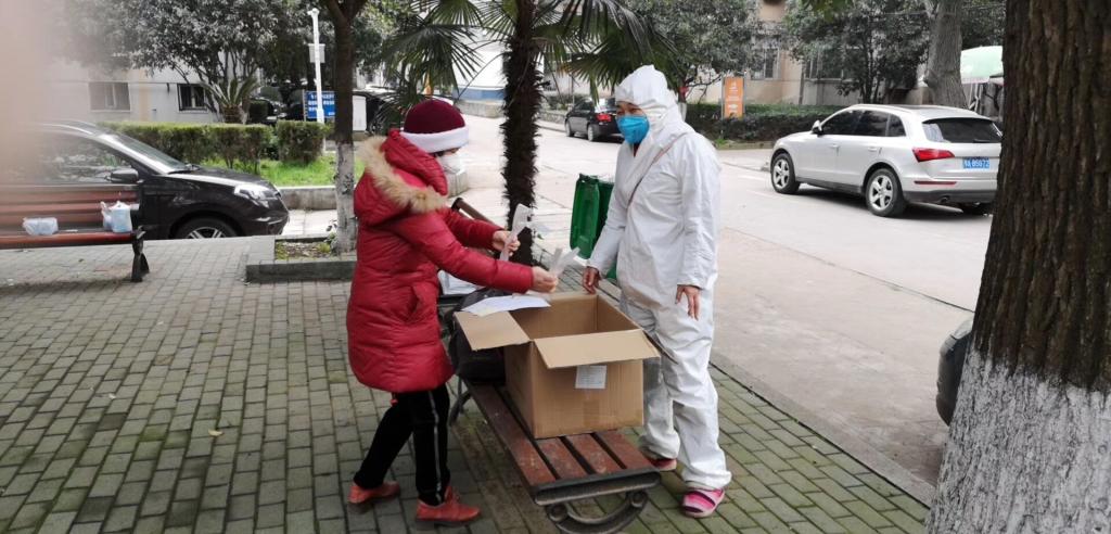 在做好单位应急联络员的同时,章芳琴还在2月27号报名参加桂子山社区志愿者,被社区分配到第四网格参加志愿者服务,负责给网格内孤寡、独居、空巢老人和特殊困难人员购买生活物资;受社区委托去武商量贩商谈为社区团购花卷、馒头,尽可能满足社区居民的多样化需求;负责接收和分发网格居民团购的蔬菜肉类口罩等。第四网格的居民们人口基数大,还有几栋楼封楼了,志愿者服务的工作量多而杂,章芳琴几乎每天为了居民的各种需求跑遍校园内外,累得浑身大汗。经常还有非本网格的居民听说章芳琴是热心志愿者,请她帮忙买药。